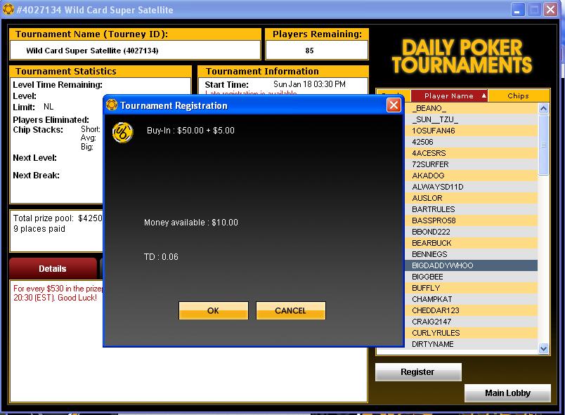 No i wasnt in the top 5. KK on the turn is no good against AQ and ofcourse after the flop JJ is a huge dog to 99. Just everytime i've won sattys on Absolute they didnt auto register me, i have to go to it and sign in.....