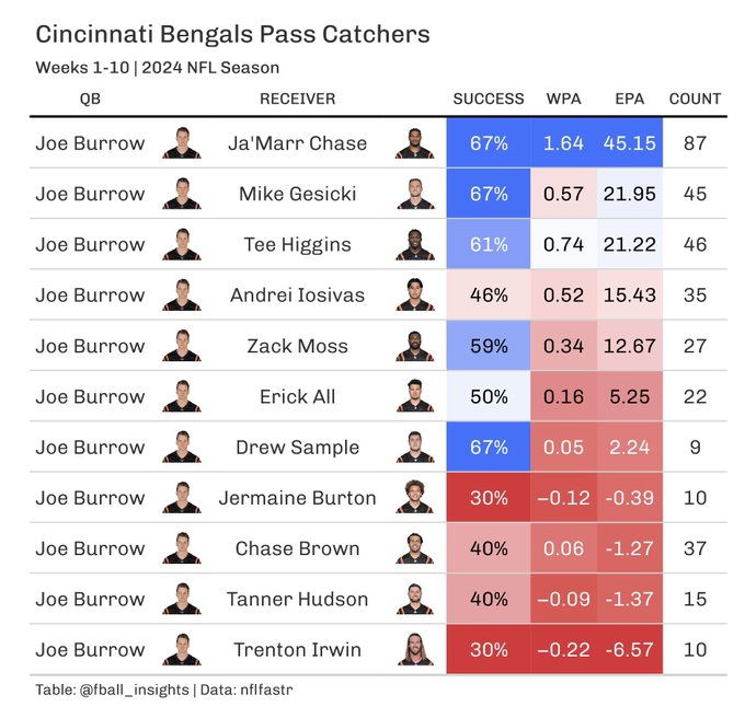 As you can see, without Chase and Higgins to a lesser a degree, Joe Burrow is hot garbage. HOT!
