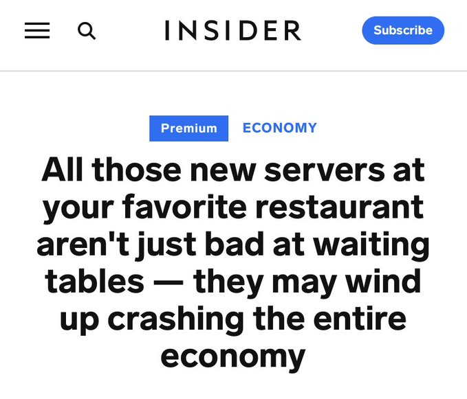 certainly agree we all walk into a restaurant with a different expected level of service than 10 years ago but to claim waitresses will crash the economy is bizarre. The economy is being compromised from the inside like mandating brutally inefficient EV technology, firing people because they won't take a killer jab, and shutting down pipelines during an energy crisis. The broad with the septum ring, Ukraine tat, rainbow wristband, and moustache plating your empanada has nothing to do with it