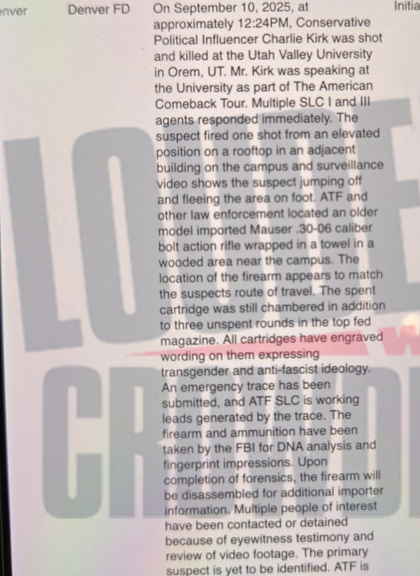 "On September 10, 2025, at approximately 12:24PM, Conservative political influencer Charlie Kirk was shot and killed at the Utah Valley University in Orem, UT. Mr. Kirk was speaking at the University as part of the American Comeback Tour. Multiple SLC I and III agents responded immediately. The suspect fired one shot from an elevated position on a rooftop in an adjacent building on the campus and surveillance video shows the suspect, jumping off and fleeing the area on foot. ATF and other law-enforcement located an older model imported Mauser .30-06 caliber bolt action rifle wrapped in a towel in a wooded area near the campus. The location of the firearm appears to match the suspects route of travel. The spent cartridge was still chambered in addition to three unspent rounds at the top fed magazine. All cartridges have engraved wording on them, expressing transgender and anti-fascist ideology. An emergency trace has been submitted an ATF SLC is working leads generated by the trace. The firearm and ammunition have been taken by the FBI for DNA analysis and fingerprint impressions. Upon completion of forensics, the firearm will be disassembled for additional importer information. Multiple people of interest having contacted or detained because of eyewitness testimony and review of video footage. The primary suspect is yet to be identified. ATF is assisting the investigation with multiple other federal, state, and local partners and the case is co-led by the FBI and Utah SBI.""