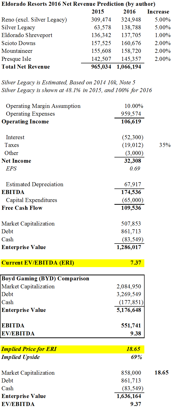 Additional disclosure: The information presented above has been compiled from SEC filings, press releases, and other information available to the public. The analysis and projections have been produced by the author based on interpretations of data and there are no representations of accuracy or future performance. I welcome and encourage comments. Healthy dialogue is the best way to understand investment opportunities. Thank you for readinghttp://seekingalpha.com/article/3957992-eldorado-resorts-solidifies-reno-presence?page=2