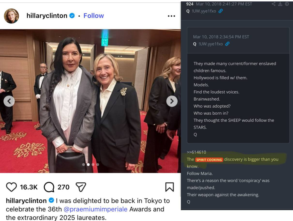 "Beautiful Hillary" met with satanic Spirit Cooker Marina Abramovic in Tokyo recently.