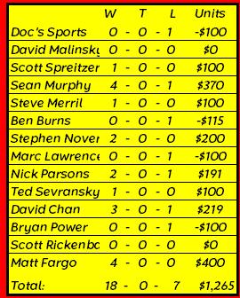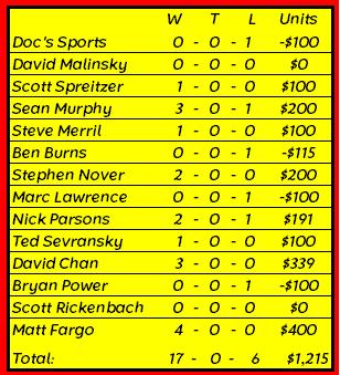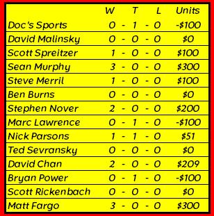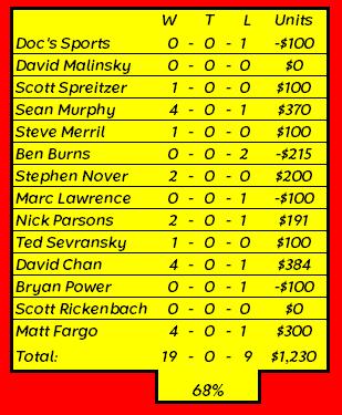 The idea of this thread is quite simple. Take the free picks from experts.covers.com and play the opposite side. I have been recording these picks on the side for a couple weeks. I will continue to record these picks daily and update the totals in this thread daily. If this losing pattern continues then i will start betting the plays. Please feel free to post the plays on the site when you see them and i will make sure they are recorded in my totals. I will do each play to win $100, simple to track. Meaning, if the line of the game is -147 then you would do $147 to win $100 profit. If the play is an underdog, for example~> +133, then you would bet $100 to win $133 profit.