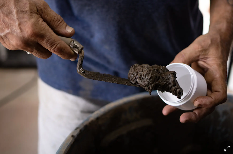 For the next four weeks, Bintliff will strain the mud into the rubber barrel, skim the river water rising to the top, use plenty of tap water to eliminate odor, apply a “proprietary treatment” he declines to describe — and let the stuff settle.