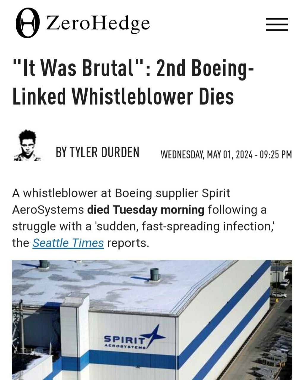 Joshua Dean, a former quality auditor at Boeing supplier Spirit AeroSystems and one of the first whistleblowers to allege Spirit leadership had ignored manufacturing defects on the 737 MAX, died Tuesday morning after a struggle with a sudden, fast-spreading infection.