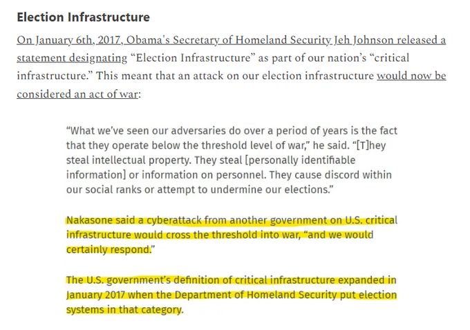 👉 "...a cyber attack from another government on U.S. critical infrastructure would cross the threshold into war"