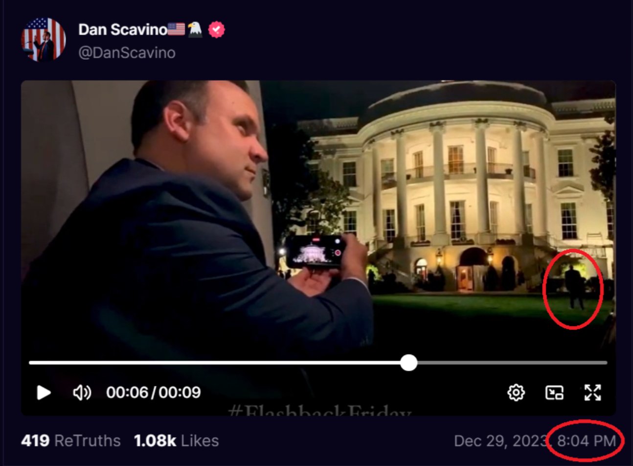 Dan Scavino dropping a bomb on Truth with his video of President Trump returning to the White House, while Luciano Pavarotti sings "Nessun dorma" In the background, has a timestamp of 8:04 EST