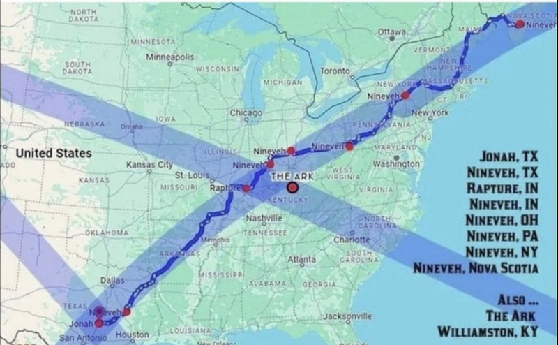 The eclipse trajectory in the U.S. has 7 cities named NINEVEH, 1 named JONAH, 1 named RAPTURE and 1 named ARK.