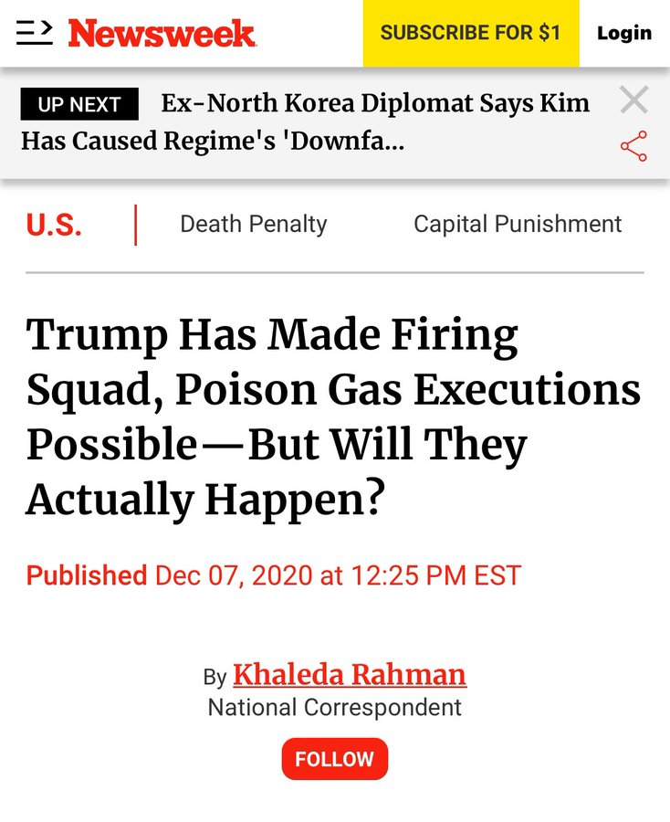 Lost in the fog of confusion that defined the days following the 2020 "STOLLEN" election was the fact that the Trump Administration quietly reinstated firing squads, lethal poison and hangings as legal methods of federal execution.