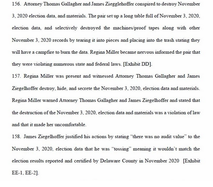 “Defendants intentionally and fraudulently conspired to destroy, delete, secrete, and hide November 3, 2020, election data, materials, and equipment to prevent discovery of election fraud and election law violations in Delaware County, which the Defendants also conspired to commit and did commit while carrying out the November 3, 2020, election…