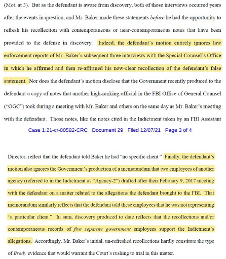 Durham also alleges that his three interviews with former FBI Counsel Baker "re-affirmed his now clear recollection" of Sussmann's false statements.