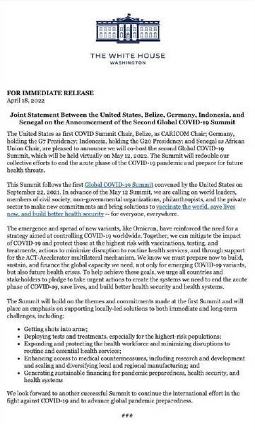 JUST IN - White House announces second global COVID summit on May 12 aiming to "bring solutions to vaccinate the world for everyone, everywhere."