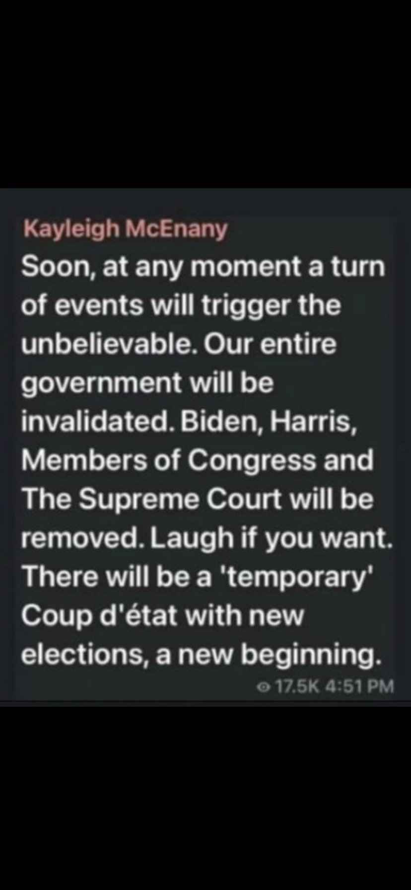 Biden will be gone and Trump either reinstated and/devolutioned, that everything in the country will immediately turn around