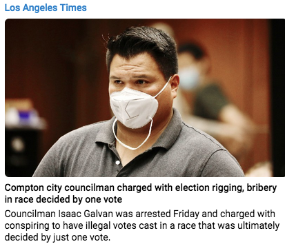 Compton City Council member Isaac Galvin, who appeared to win his seat by the slimmest possible margin of one vote, was arrested last year, along with five other people, and charged with conspiracy to commit election fraud.