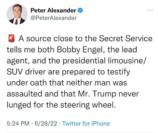 And you don’t think the SHAM committee would be licking their chops to have the two people who were in the car give first hand testimony that this really happened ? This is what happens in a kangaroo court . Tell me again who cross examined the star witness today ? Lol !