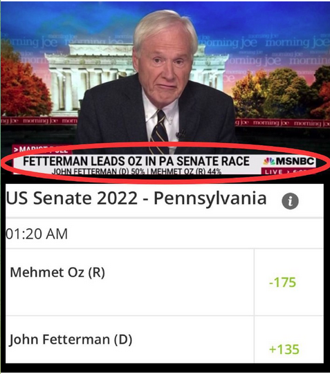 MSNBC says Fetterman is up 6 points, but if you want to put money on it, Dr. Oz is the heavy favorite.