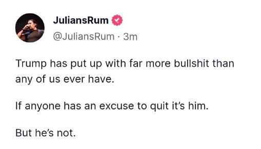 President Trump has every reason to quit yet he doesn't because he loves the people and wants to save the children.