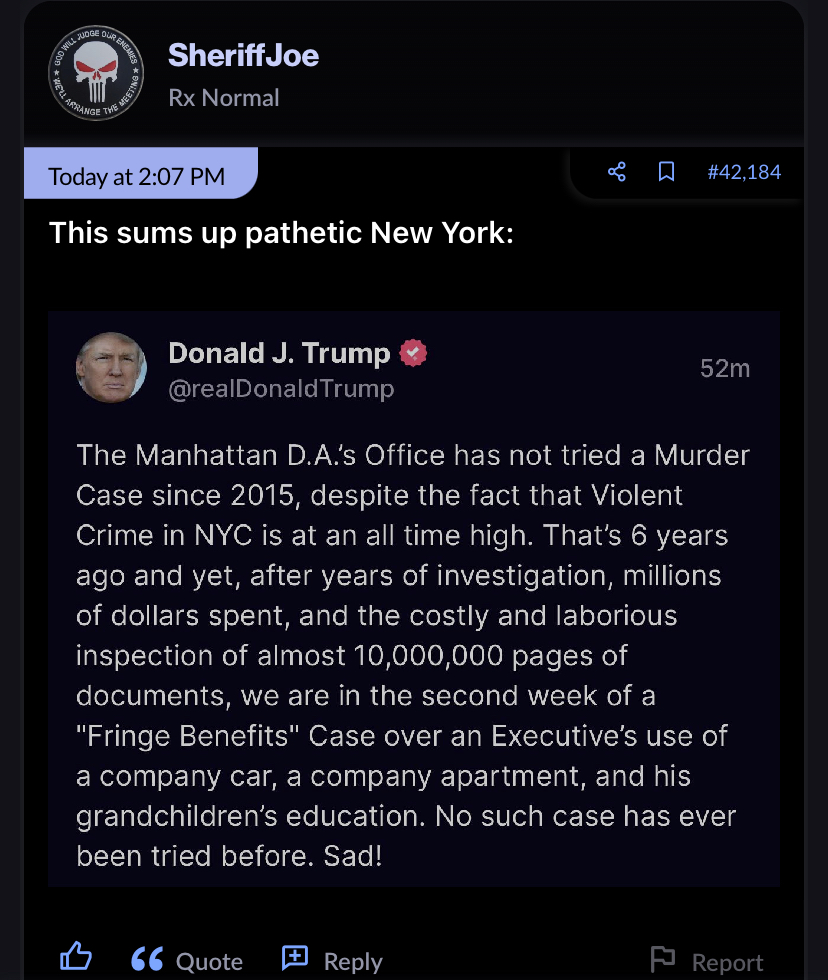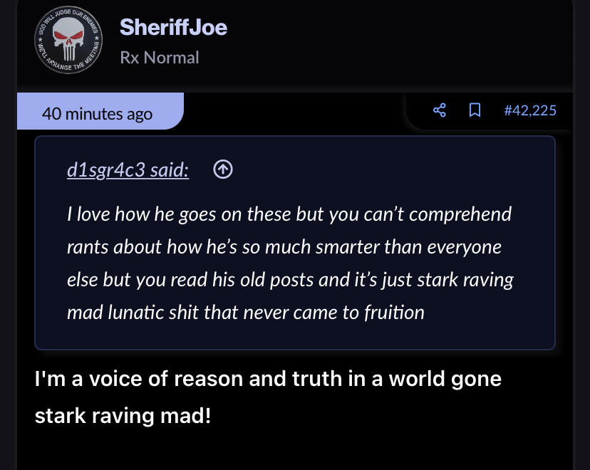 I'm a voice of reason and truth in a world gone stark raving mad!I love how he goes on these but you can’t comprehend rants about how he’s so much smarter than everyone else but you read his old posts and it’s just stark raving mad lunatic shit that never came to fruition