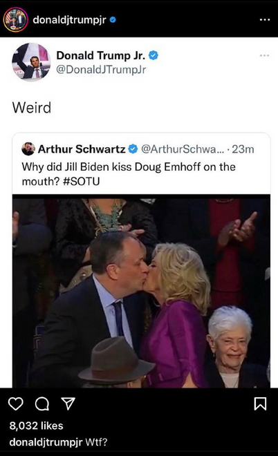 Jill kissing Kamala’s husband… And Donald Trump's former advisor Kellyanne Conway shared a picture of the smooch with similar delight, quipping: "Wow, Covid really is over." end this thread or move it to the classic room…