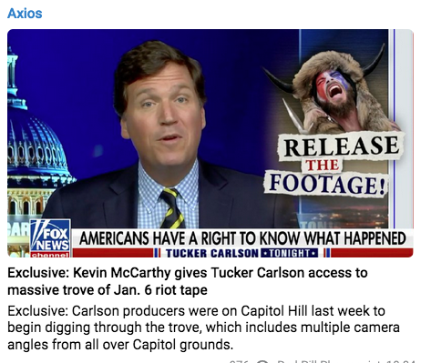 “Carlson TV producers were on Capitol Hill last week to begin digging through the trove, which includes multiple camera angles from all over Capitol grounds. Excerpts will begin airing in the coming weeks.”