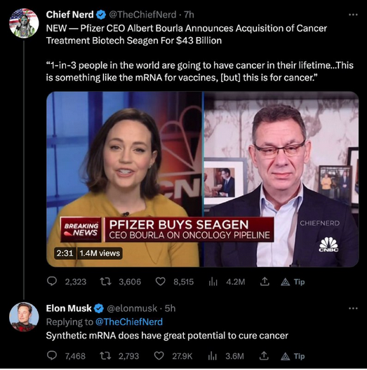 But now that they are exposed, he now openly supports Pfizer and their mRNA agenda for "curing cancer".