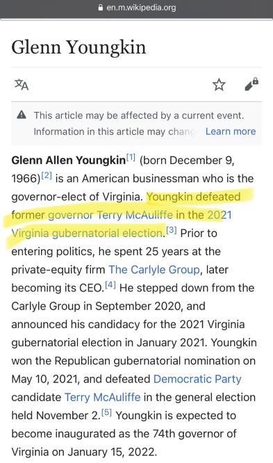 Glenn Youngkin spent 25 years at the private-equity firm The Carlyle Group. Do some research on them. Very interesting organization. Eventually, every political office and private bank cartel position will be held by a private-equity vet.