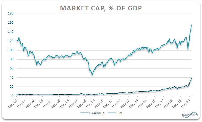 The deterioration in market breadth reflects the performance of the FAAMG stocks which are now valued at almost 40% of GDP, on par with the entire market at the 2009 low.