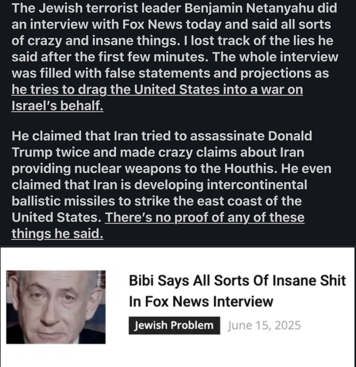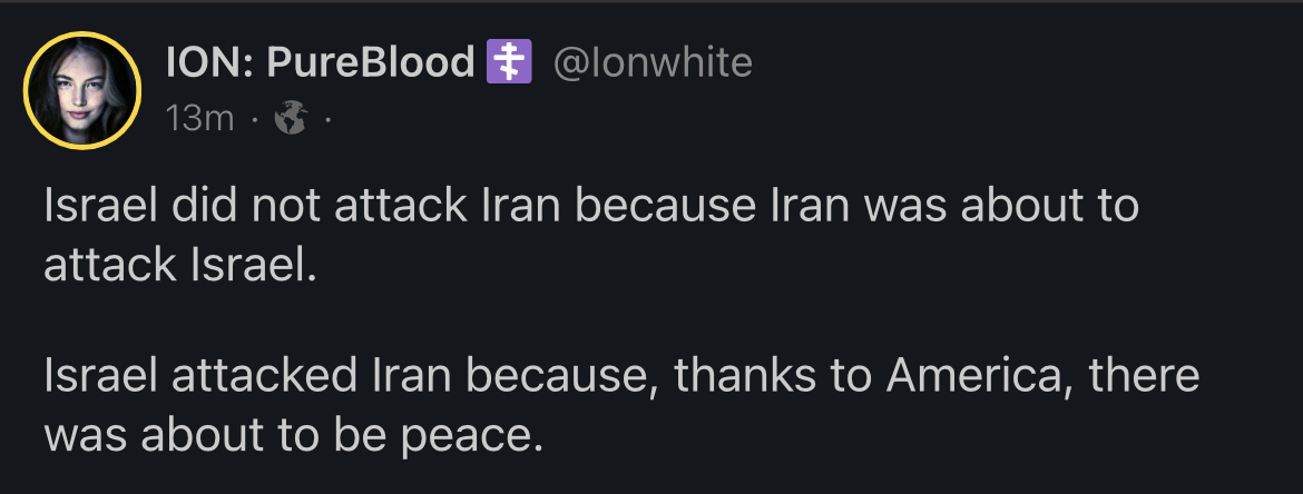 doctorsuccess Member Joined Sep 12, 2022 Messages 4,753 Tokens Jun 15, 2025 #97 MAGAking1 said: What do you think is going on? Click to expand... Wag the dog. Israel never fights their own wars - they're too pussified to do that. They get stupid white Americans to fight and die for them. It is simply not plausible for them to attack a major power like Iran on their own.