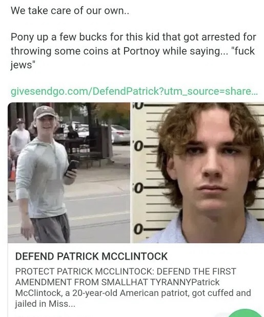 GiveSendGo has been setup by Tom Hennessey for Patrick McClintock the young man who said “fuck the Jews” to the Jewish terrorist Dave Portnoy while he was doing one of his gay pizza reviews. He was wrongly arrested and charged with crimes for hurting Portnoy’s Jewish feelings. I donated $25 to it.