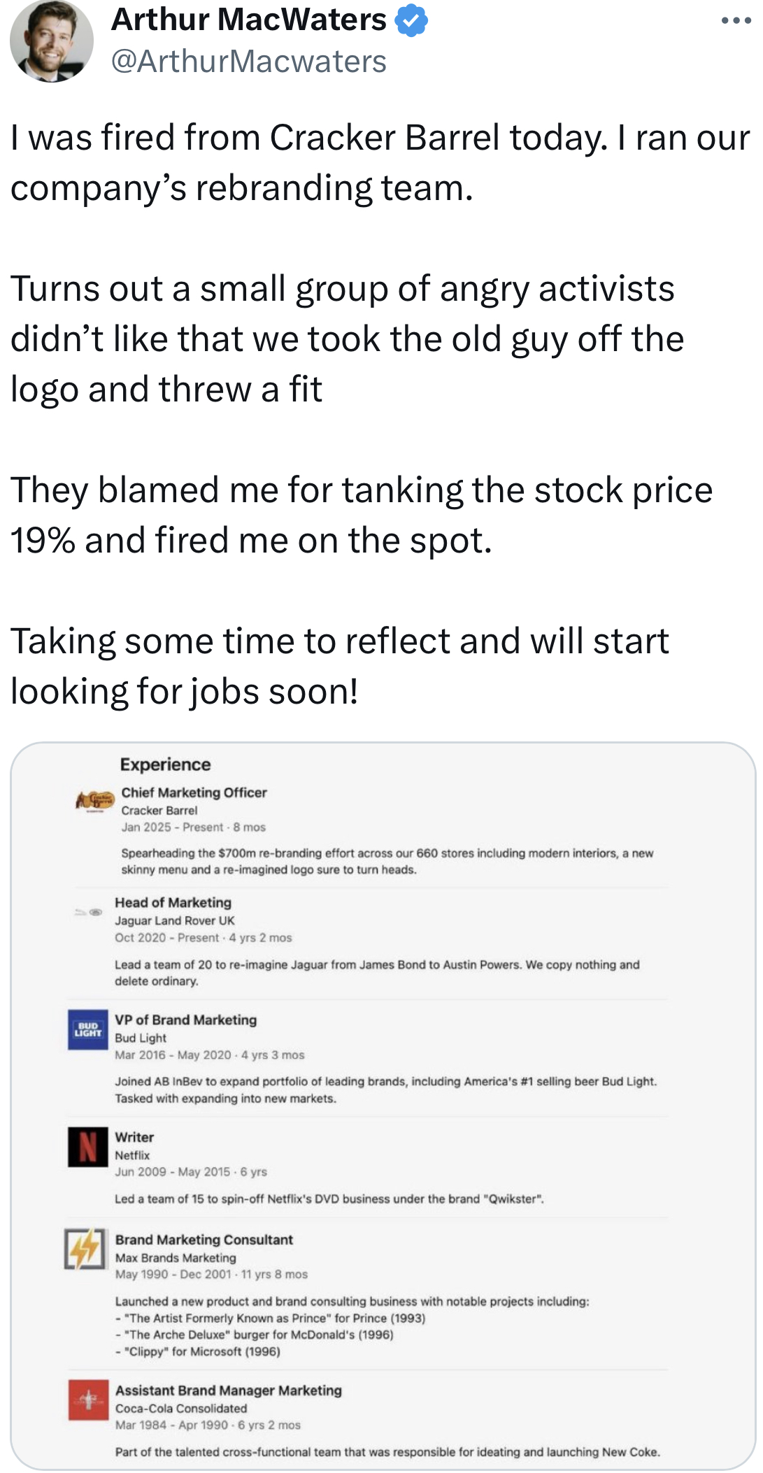 This along with Cracker Barrel's CEO recent embarrassing "apology" (without changing the logo back) and now Trump's post weighing in confirm the whole thing was another White Hat operation designed to wake people up. Another staged "Bud Light" catastrophe.