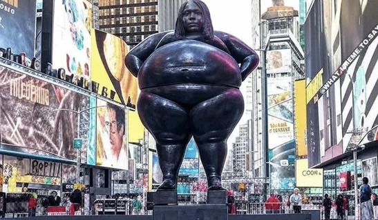 overweight, grumpy lady giving side eye to tourists from all over the world as they wander Times Square.
