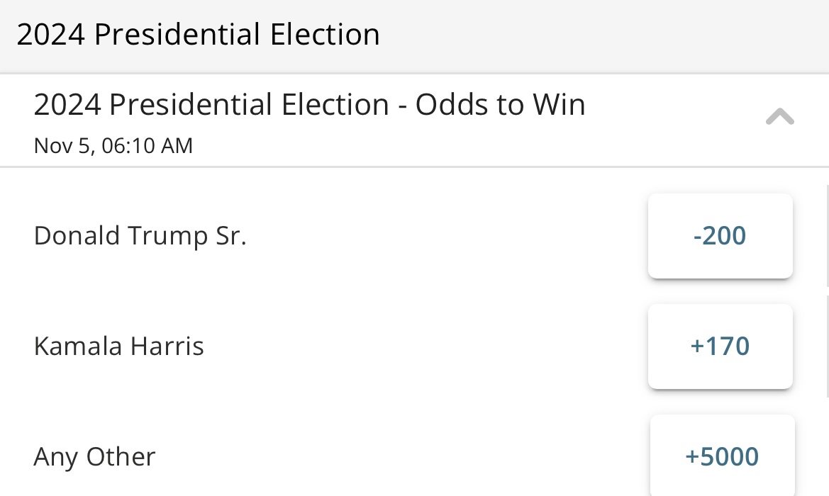 Winning Party Winning Party 3999091 Democrats -125 3999090 Republicans +105 3999092 Any Other Party +5000