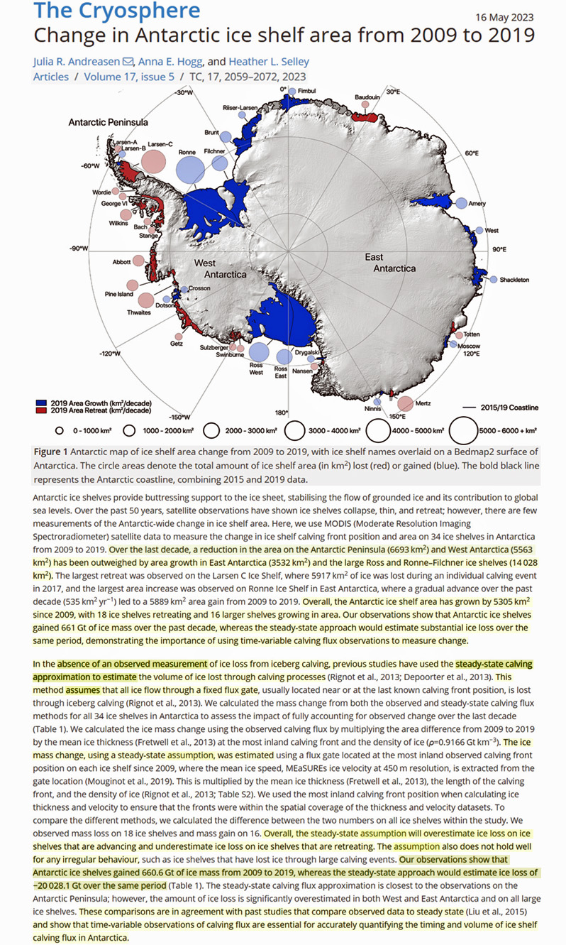 Antarctica gained 661 billion tons of ice during 2009-2019 vs. a prediction of a 20,000 billion ton loss.