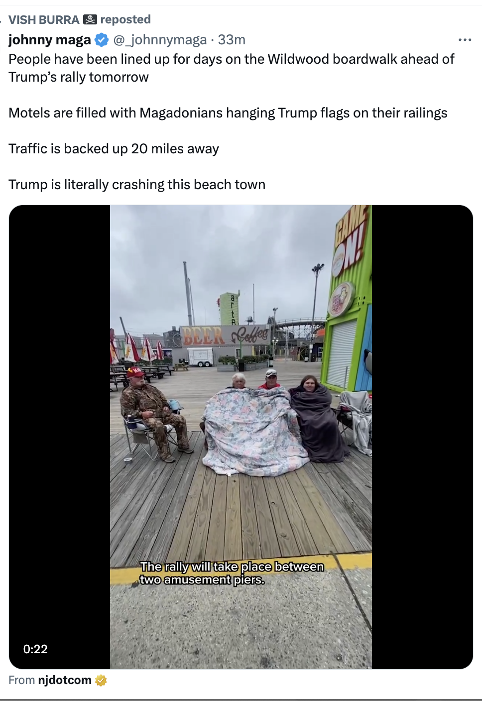 StevieRay said: Lol. FJB would have had maybe 26 people show. And that’s the fake media View attachment 89454 Click to expand... I OWN PROPERTY IN WILDWOOD HOTELS WERE BOOKED UP BECAUSE TRUMPERS ARE POOR ASSES THE PARKWAY WASNT BACKED UP TRUMPERS LOVE THE LIES .... LIE LIE LIE .