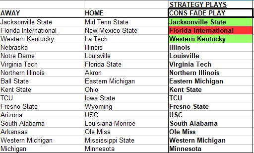 NCAA Consensus Fade Plays - this weeks plays / this season's weekly record / last season's weekly record.