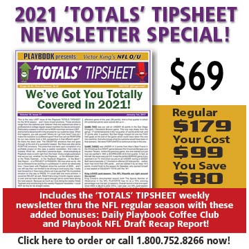[FONT=&quot]The only Over/Under NFL Totals Newsletter in the nation. Best Bets 199-144-4 Last 6 Years. Winning Seasons 12 of Last 13 Years. Overall 381-279-8 ATS (58%). Available every Tuesday thru the end of the NFL regular season via Member Center Thursdays after 5 PM ET. NFL Team Total Of The Week 25-9 last two seasons! You also receive a digital 2021 Playbook Yearbook Magazine Added bonuses: FREE 7 DAY A WEEK COFFEE CLUB