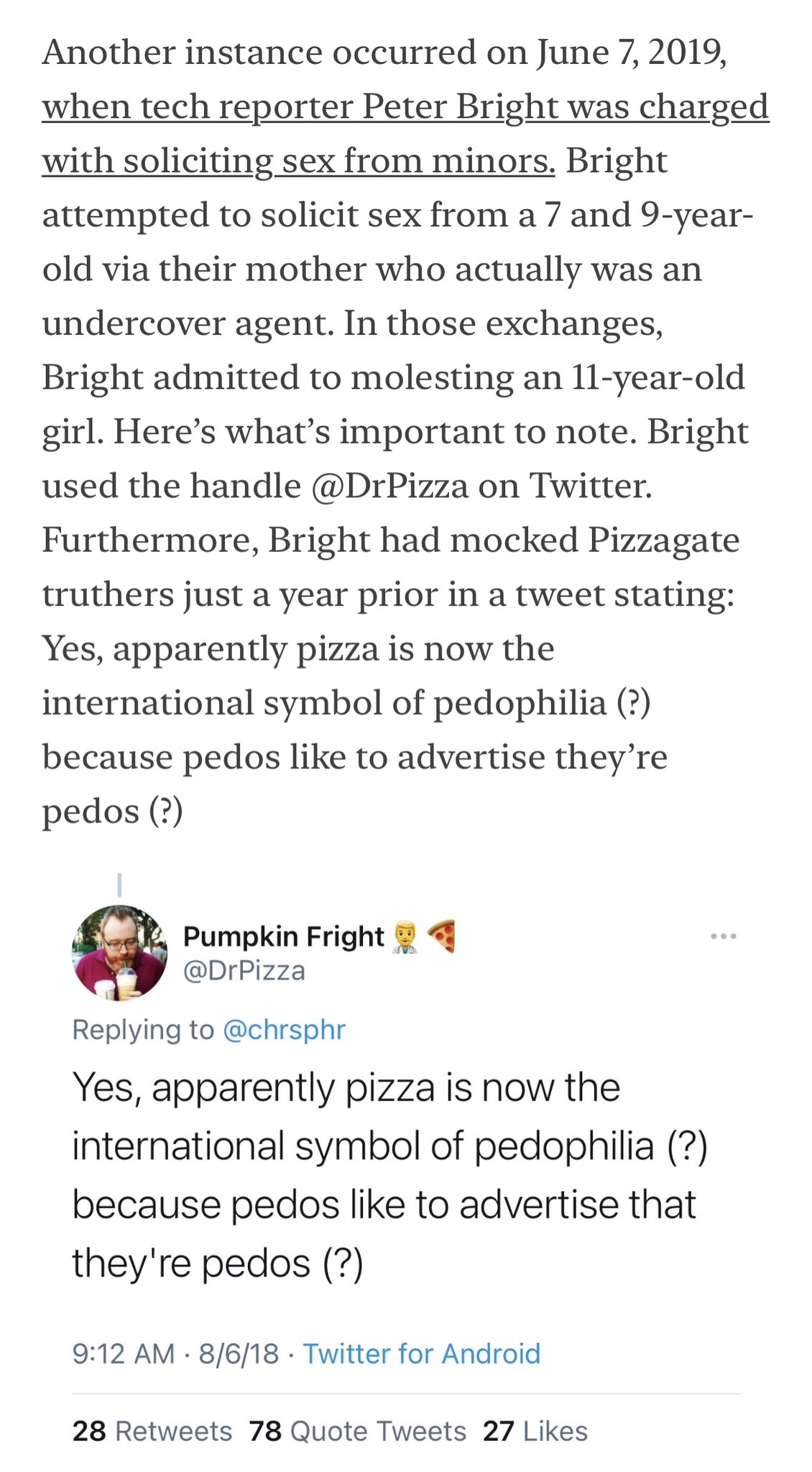 Meet journalist Peter Bright AKA Dr. Pizza! Read what he had to say about Pizzagate in 2018. Fast forward to 2020, he was convicted for attempting to have sex with a 7 and 9-year-old and admitted to molesting an 11-year-old.