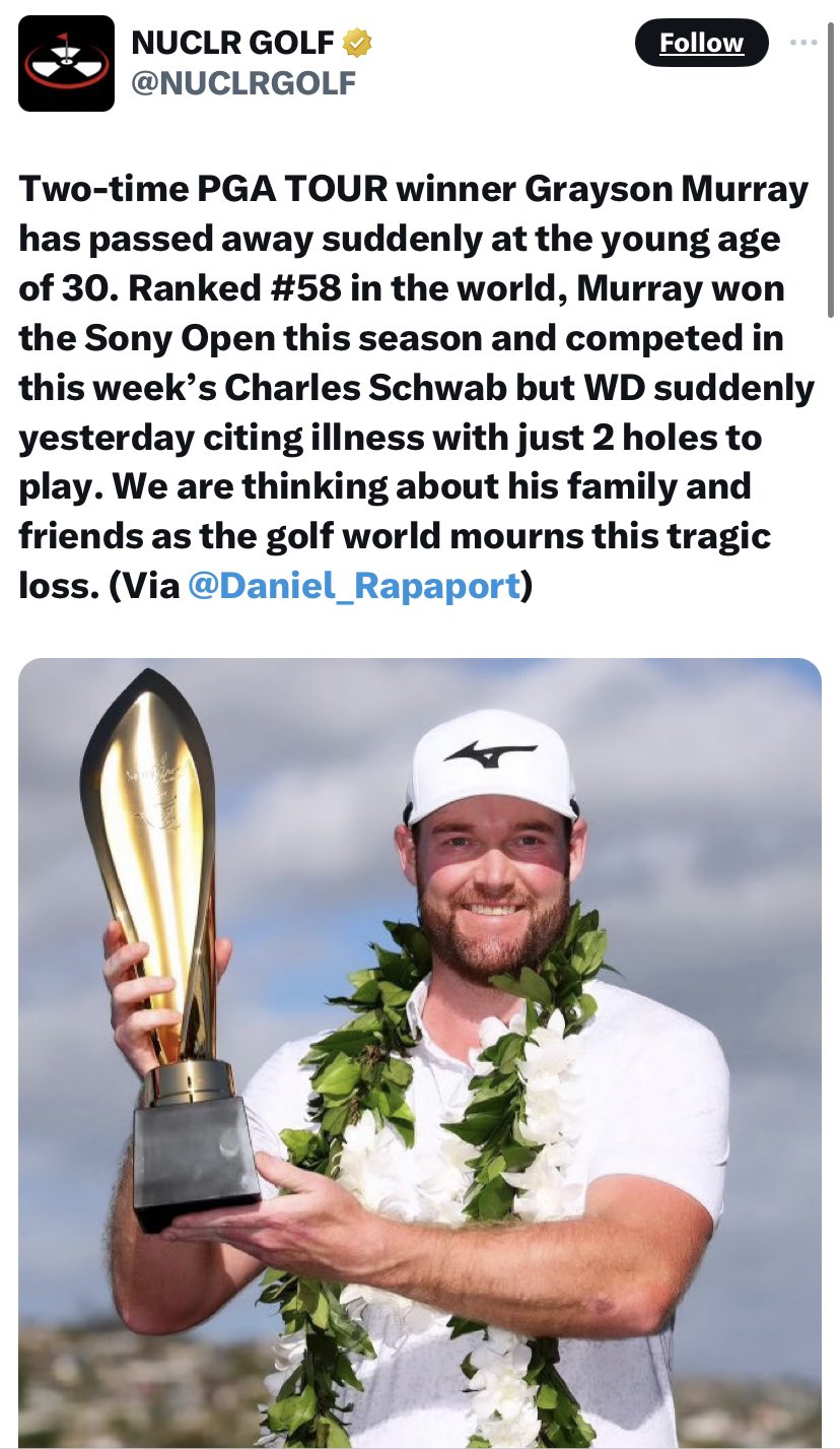 “We would like to thank the PGA Tour and the entire world of golf for the outpouring of support. Life wasn’t always easy for Grayson, and although he took his own life, we know he rests peacefully now.”