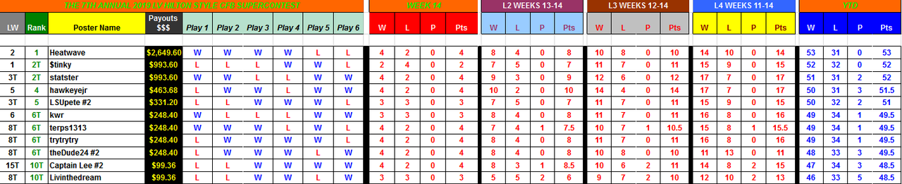 Congrats to Heatwave in winning the 7th Annual Hilton Style College Football Contest. $2649.60 is his winning share. A rough final week dropped $tinky back into a 2nd Place tie with statster, who climbed one spot to earn the tie. Each will share 2nd & 3rd Place money which comes to $993.60 each. hawkeyejr finished 4-2 and jumped up one spot to sole possession of 4th place and $463.68. LSUpete #2 rounds out the top 5 and a $331.20 share. A 4-way tie for 6th and a $248.40 share for each goes to kwr, terp1313, trytrytry and theDude24 #2. Captain Lee #2 and Livinthedream have to split the final payout for 10th place and $99.36 each.Those receiving payouts should PM Willie99 & Livin the Family Life! to confirm how and what you wish to be paid. You may not be paid by the same guy you sent money to. No worries... everyone will get back the correct amount. A big thanks to Willie & LTFL for their handling of the funds this year. Truly a big help.