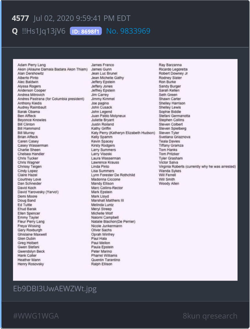 It originated as Qdrop 4577 on Jul 2 2020 and the drops around it circulate around Epstein Island and Trafficking including pictures of SlickWillie and RachelChandler on LolitaExpress and survelliance images from an underground horror show on the Island (Im talking stuff of nightmare)