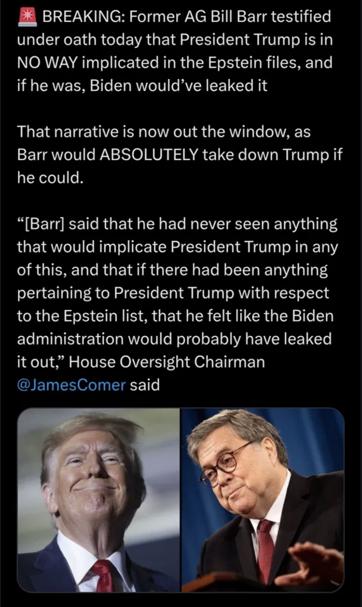🚨BREAKING: Former Attorney General Bill Barr — a man who has made no secret of the fact that he is not a Trump fan — testified under oath today that President Donald J. Trump is not connected in any way to the Epstein files.