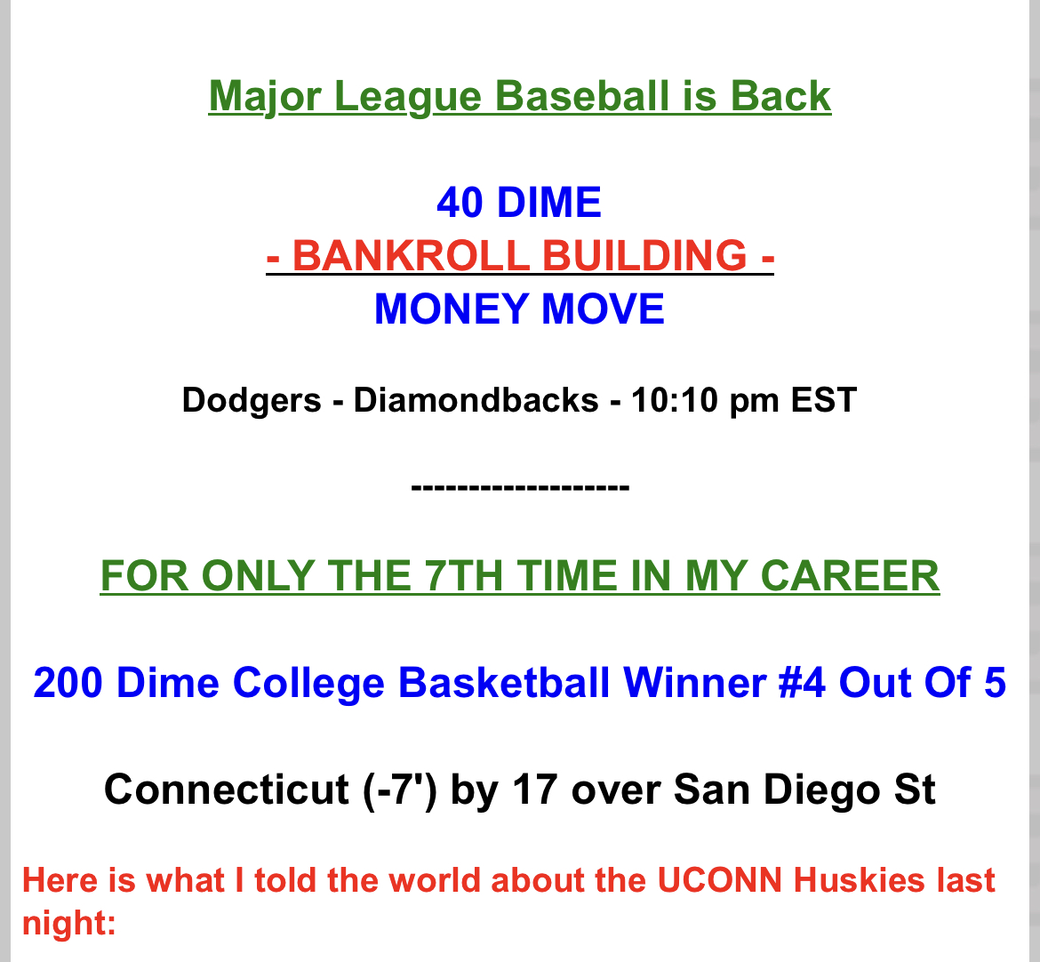 So after the huge 200 dime winner on UCONN Monday night, I push with the Magic on Tuesday, drop the Pistons at home Wednesday and of course Arizona last night.