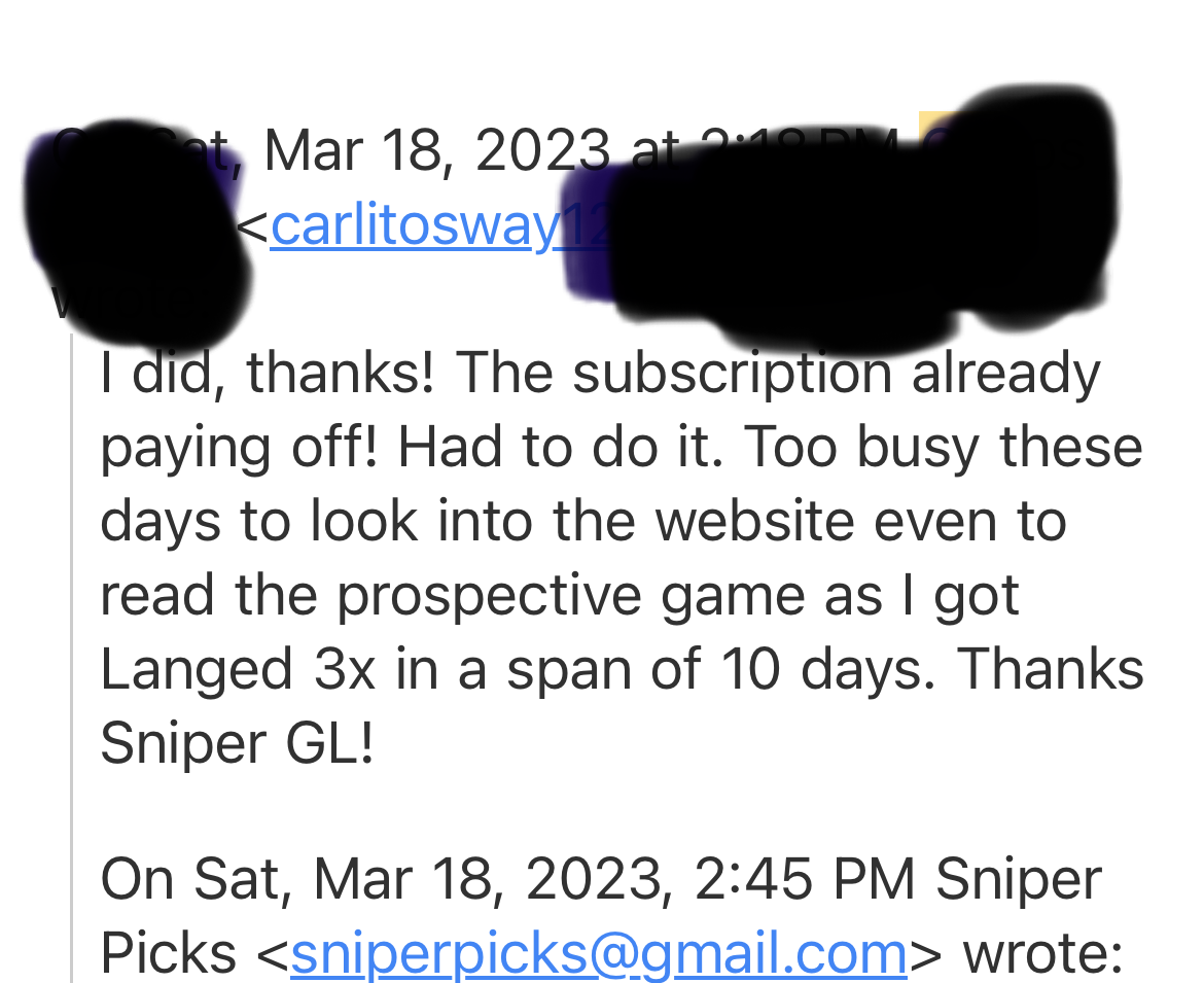 Yes, that was my email when I first joined the group as I had a very busy work schedule and thought you would be professional and email the plays in a timely fashion. Little did I know what a headache and inconvenience it would be. I was patient and understanding for months but got seriously pissed off when you didn't email my pick on a particular day and you were busy bullshitting and pushing your email service on this forum instead of emailing me my pick.