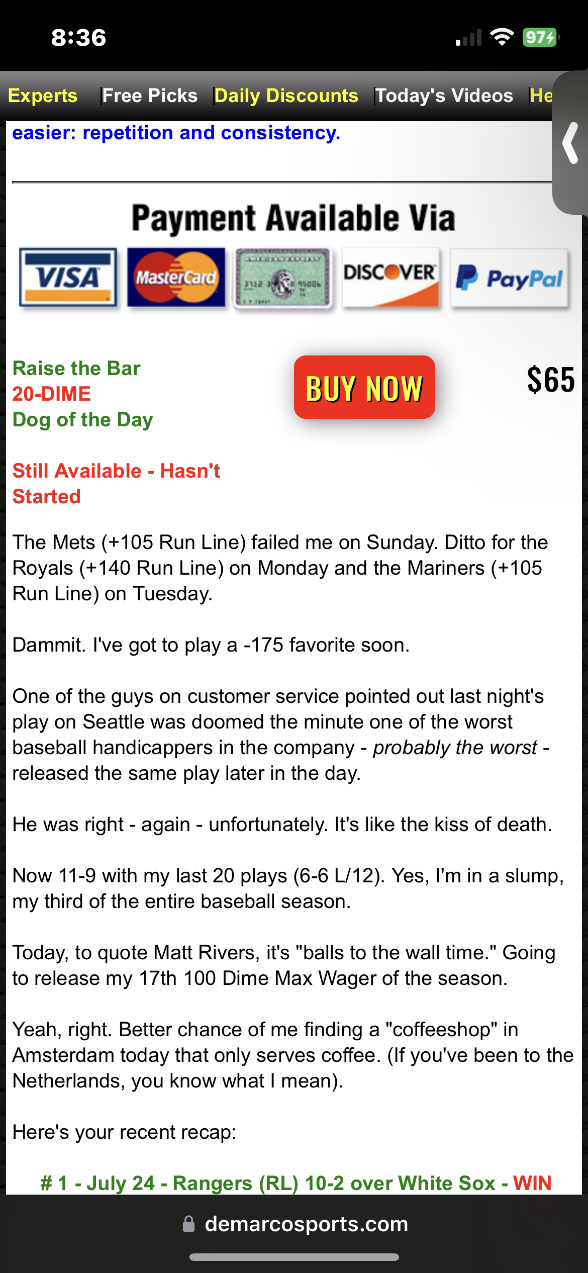 So after the 150 dime gift on the Dodgers run line Saturday 10-0, I come back with a 3 straight losses with the 60 dimer Sunday and 50 dimers Monday and Tuesday.
