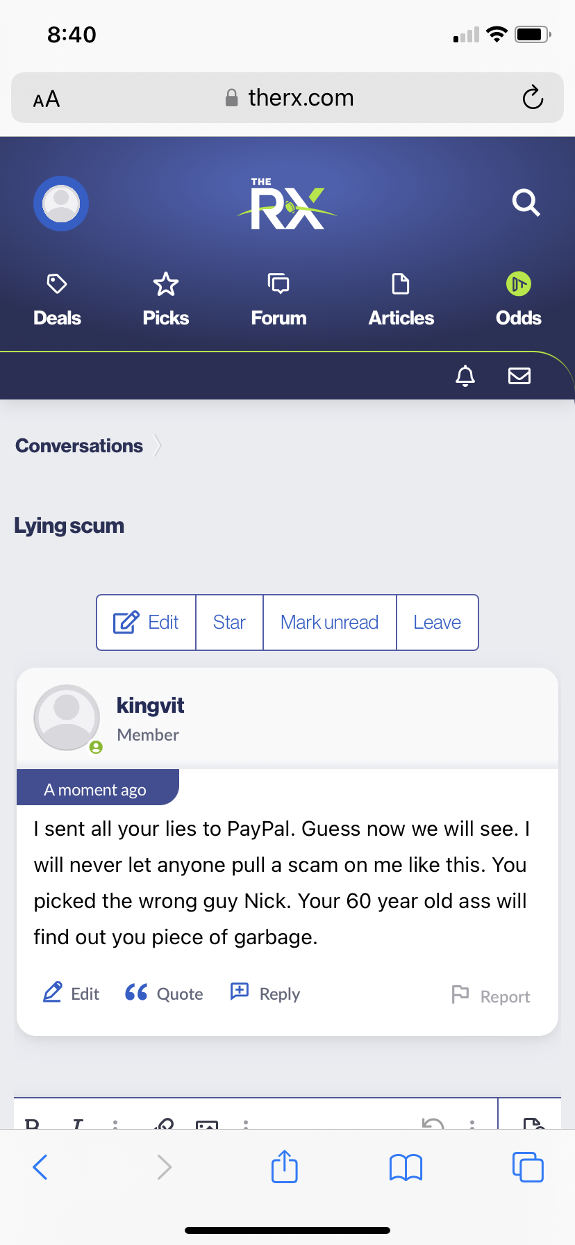Post it here scumbag. Post your proof. But your fake documents like you sent me fake tickets. You’re damn right I sent you an email. Called you the liar and scumbag you are. Rx should suspend your account.
