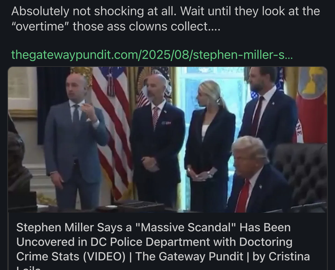 skoda Member Handicapper Joined Sep 21, 2004 Messages 14,059 Tokens Aug 26, 2025 #12 DJT is a man that speaks with straight tongue….. Loving it! Amazing after just one week no crime or murders! something changed