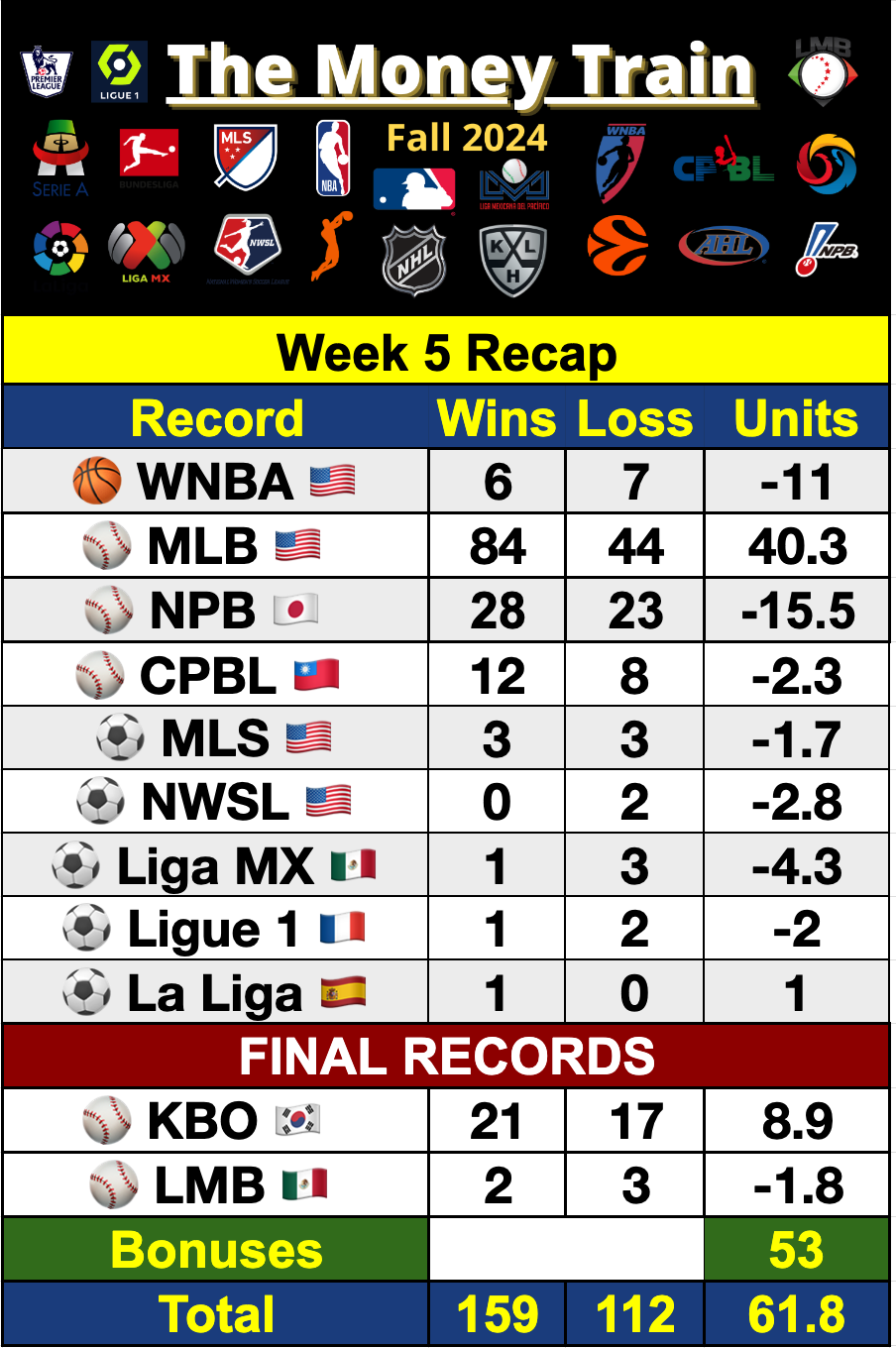 Record 159-112 = +61.8/100u 💰