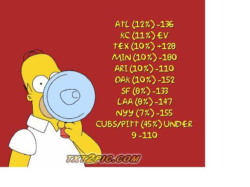 Today's highest rated play would be Atlanta at (12%), but I play all for 1 unit each.