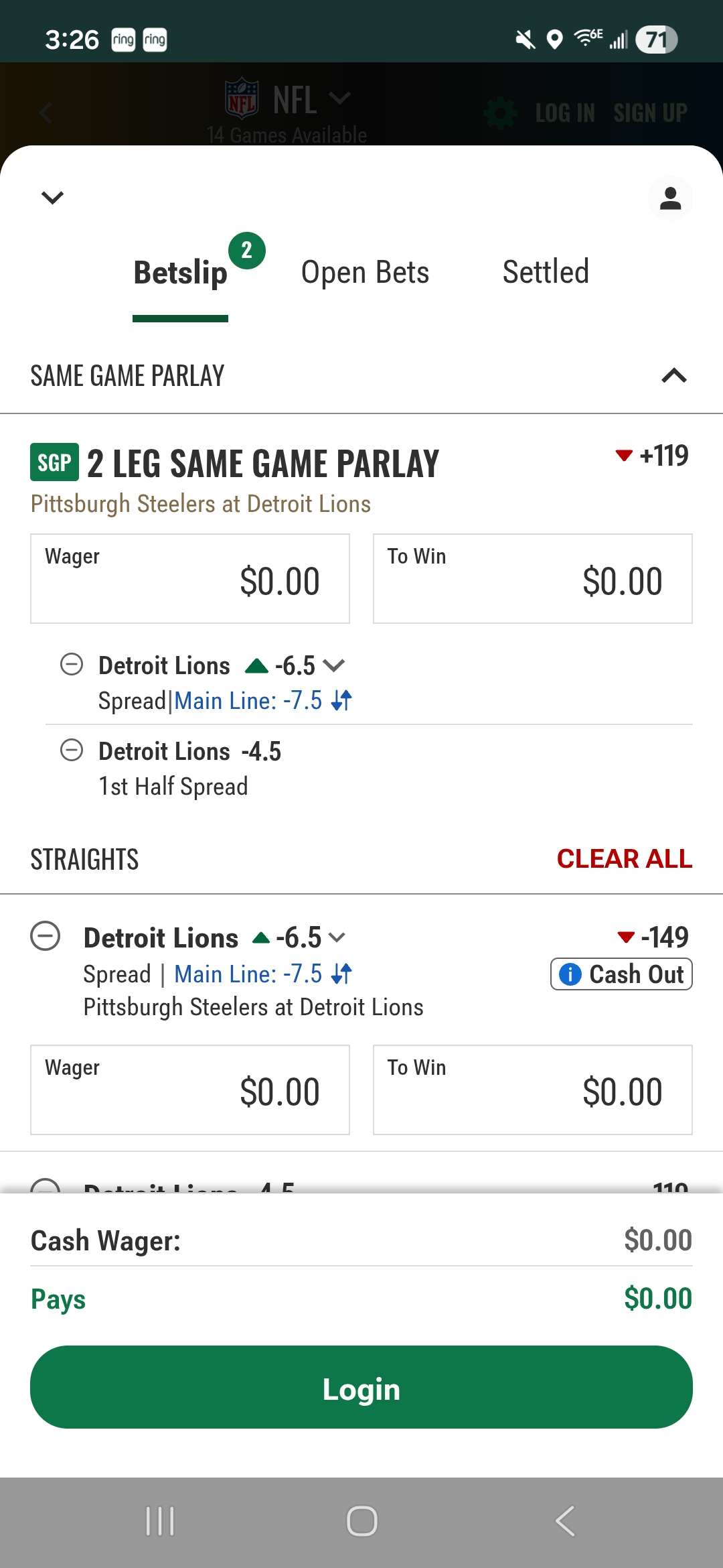 my guy in Las Vegas that place my bet week 15 on a parlay is on Vacation and just send me a reply last night…… he could not get this Parlay in He found one That reduces the payoff. so he know im flexible. So he did a 4 team money line 300 to win 3438