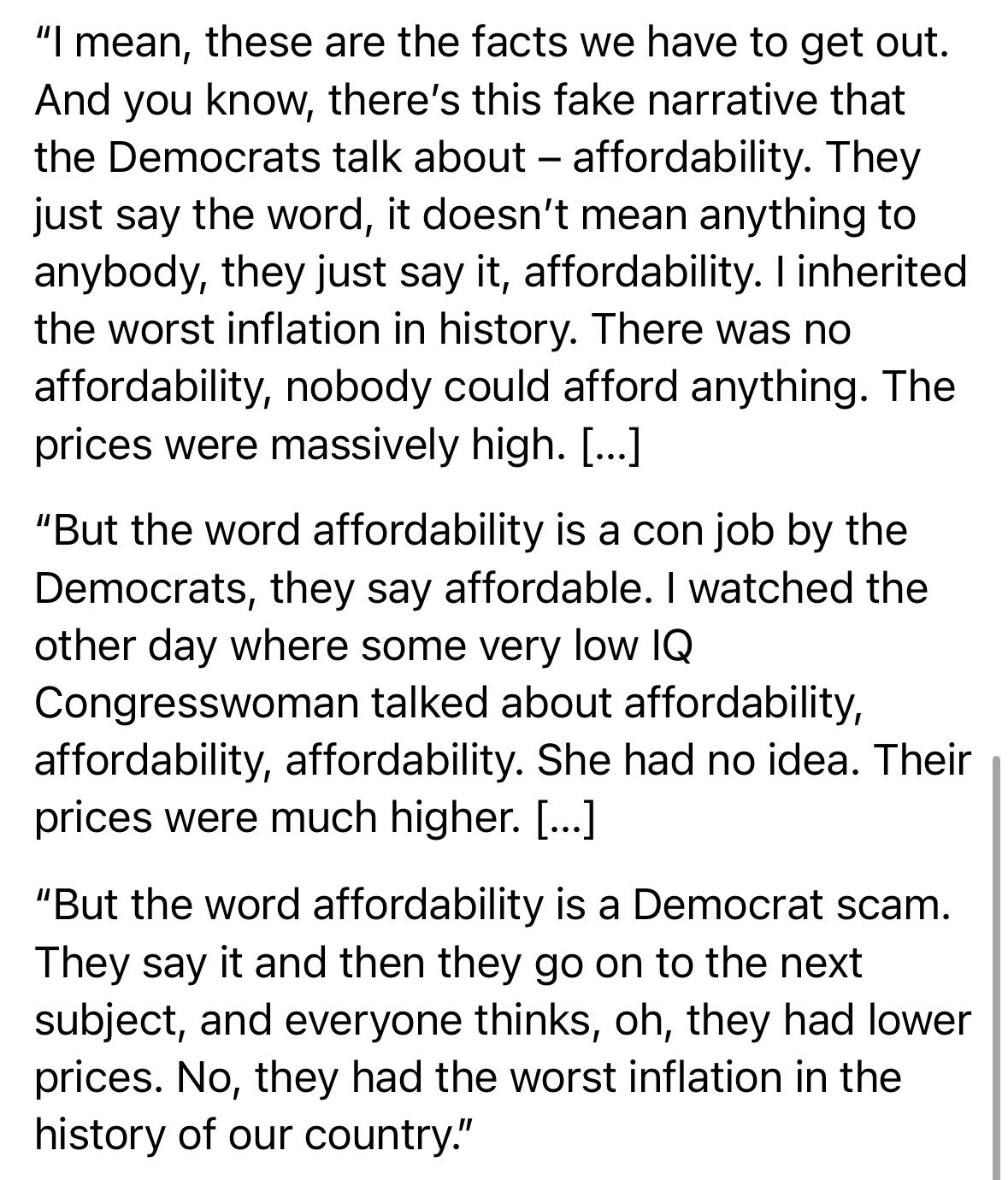 After ticking off what he claimed were trillions of dollars of investments and other economic accomplishments, Mr. Trump called the issue of affordability a “fake narrative” and “con job” created by Democrats to dupe the public.
